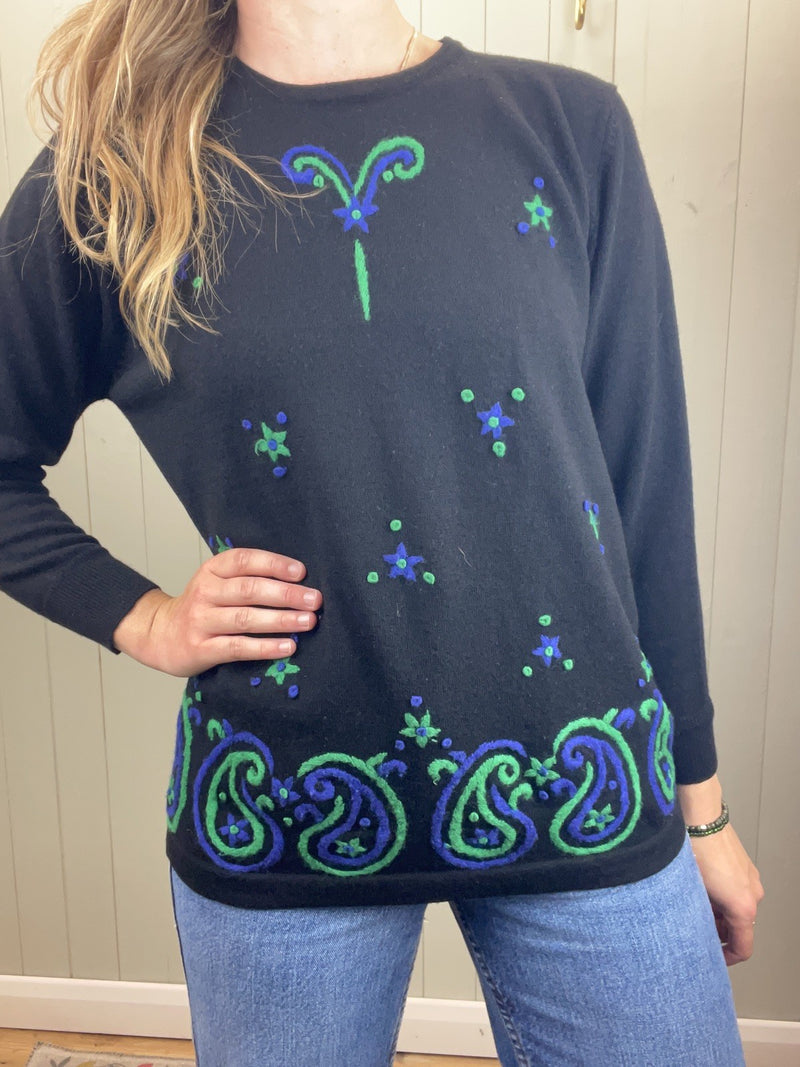 Vintage Size L 10-14 Black Funky Boho Patterned Pure New Wool Knit Jumper
