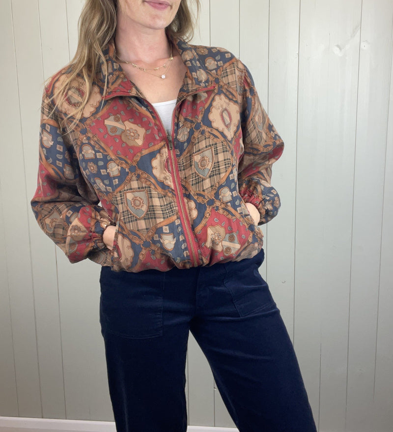 Vintage Size L 8-14 Burgundy Blue Patterned Silk Light Jacket EVR