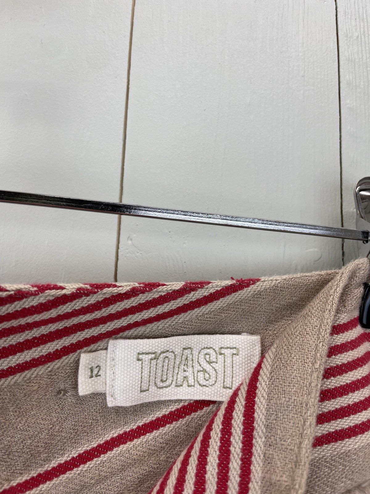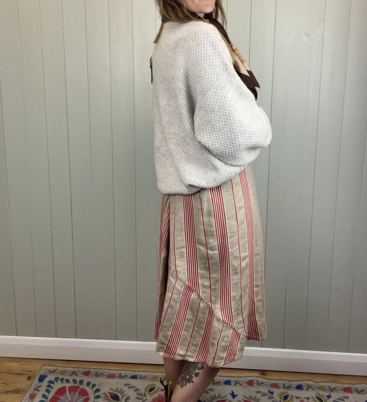 Super gorgeous oatmeal brown midi skirt by Toast. Great asymmetric stitching details and mid waist fit. Patch flap pocket to the front and invisible zip fastening with button. Lined. Looks gorgeous with a chunky knit and boots for A/W or vest top for summer!