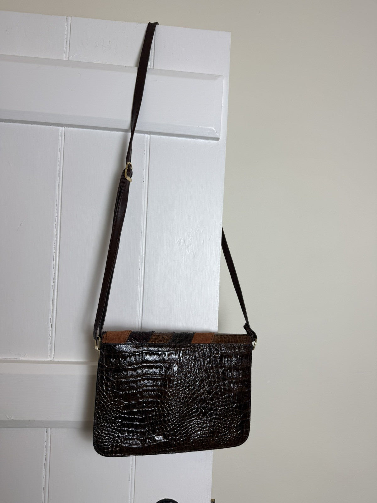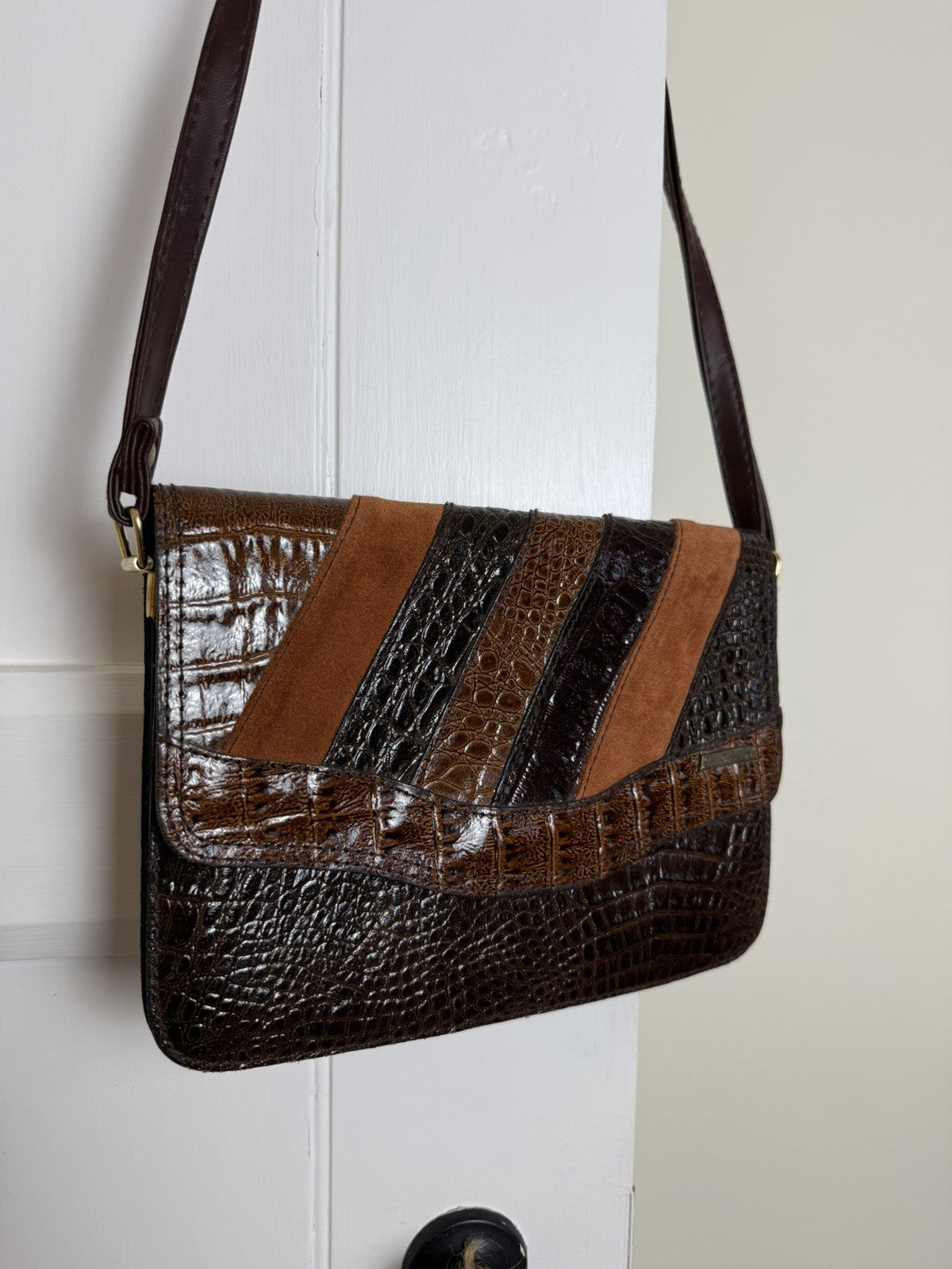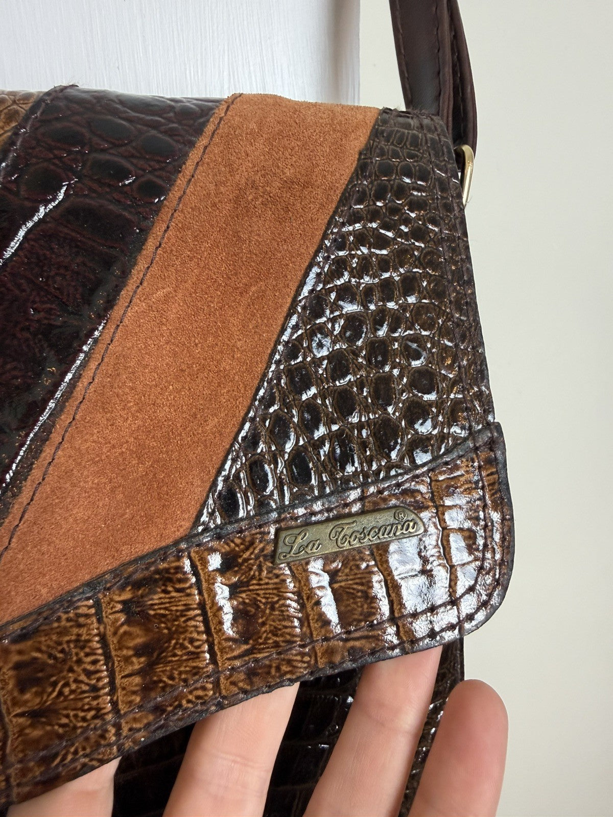 Super gorgeous vintage 80s brown genuine leather bag by La Toscana. Great classic quality bag perfect for everyday or occasions! Great contrast leathers pattern and lots of inner pockets.
