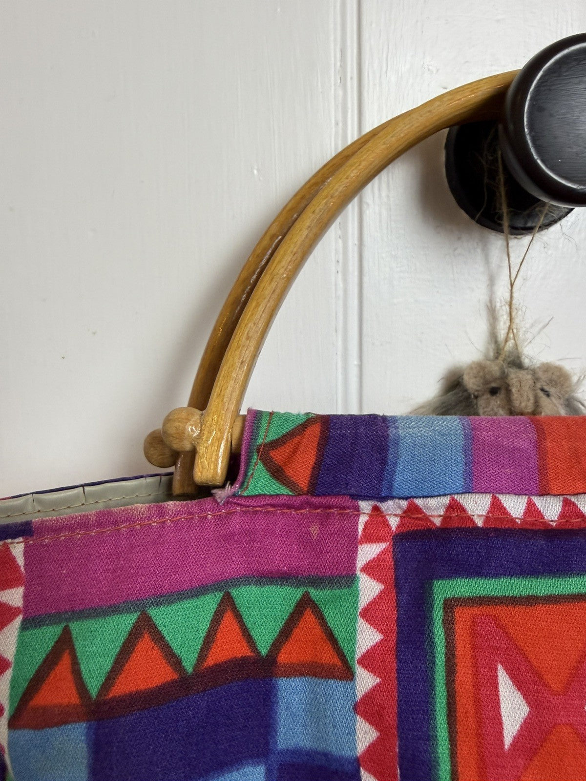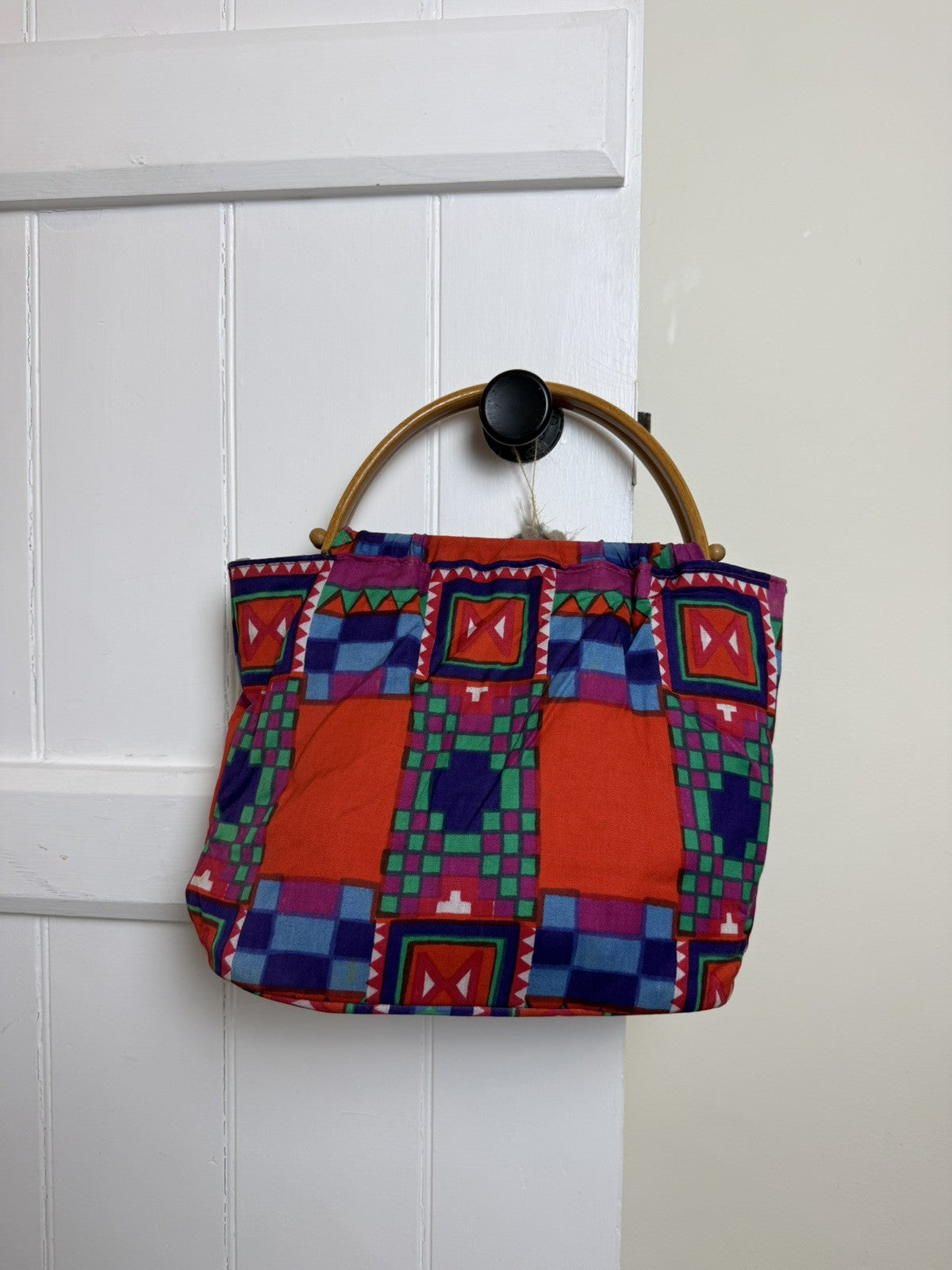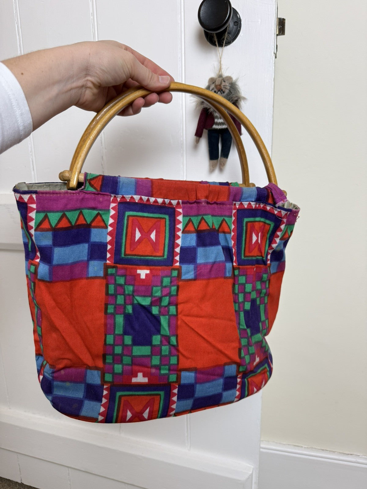 Super gorgeous vintage fabric patterned handbag. Gorgeous colours and patetrn. Wooden handles and lined with a waterproof type fabric. Shaped bottom. Super sweet!