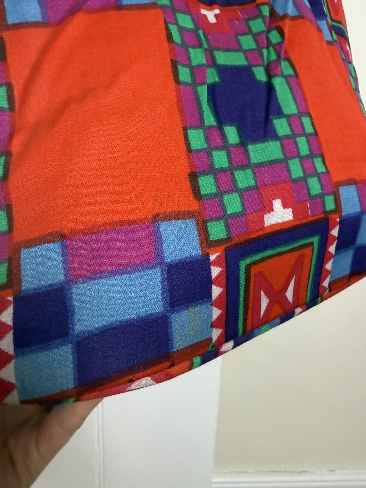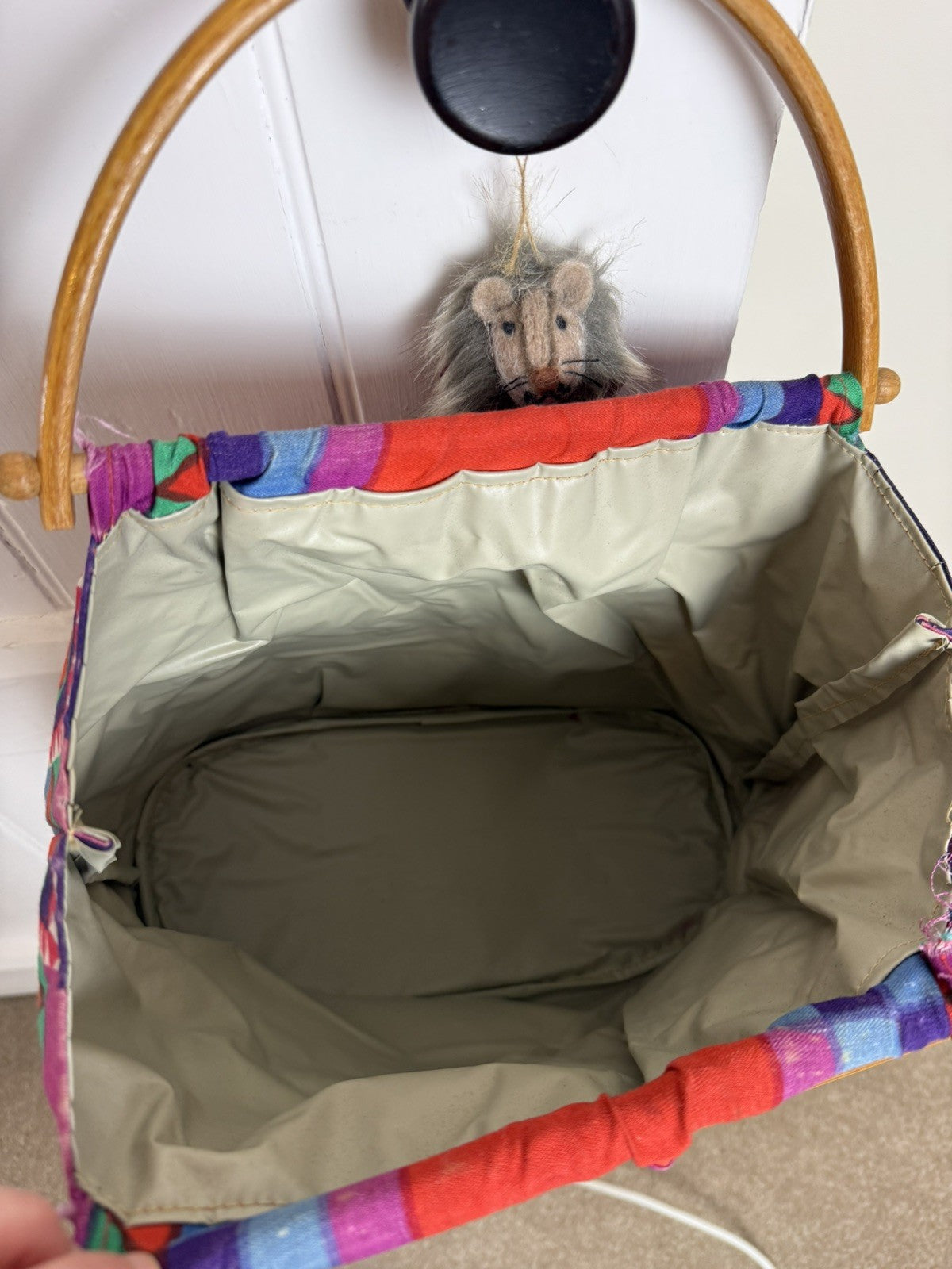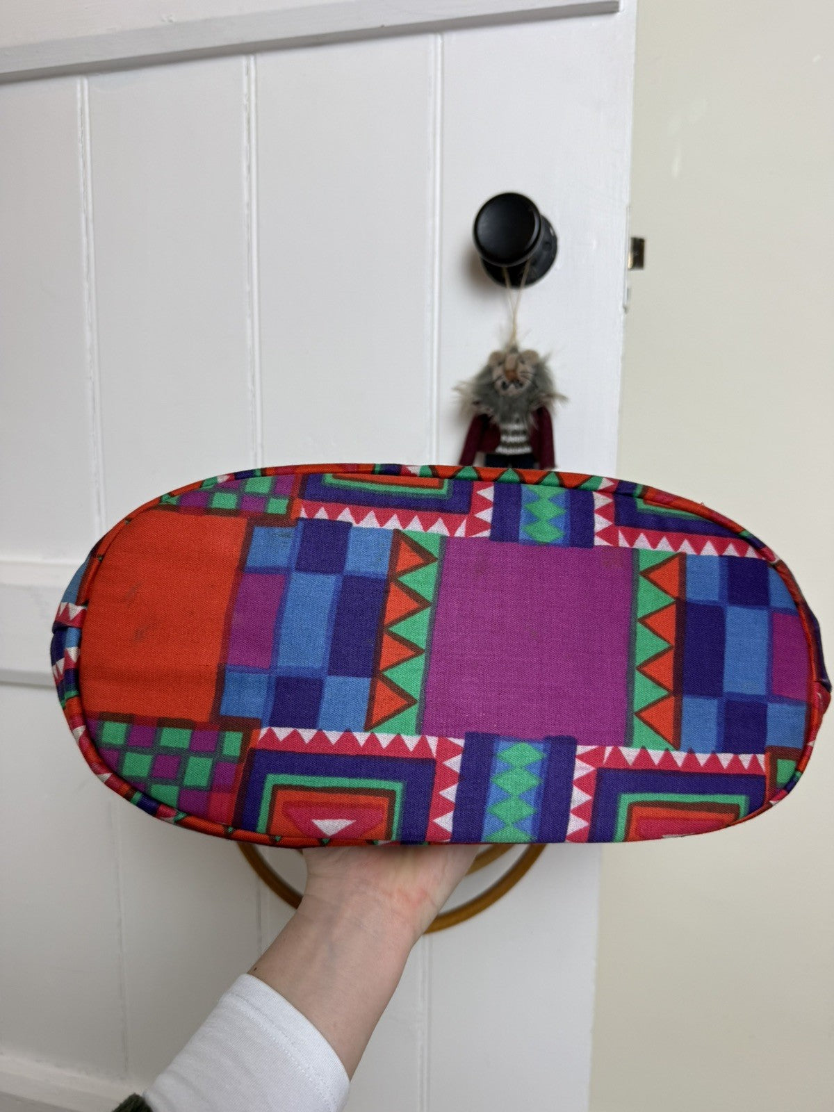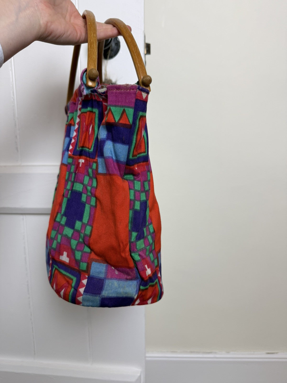 Super gorgeous vintage fabric patterned handbag. Gorgeous colours and patetrn. Wooden handles and lined with a waterproof type fabric. Shaped bottom. Super sweet!